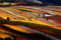 是在不同的角度看大片起伏有致的山坡。不同季节山坡上不同的地块有不同的色彩,勤劳的农民在其中耕作或收获。丽日蓝天,白云红土,赤橙红绿青蓝紫构成的美景。